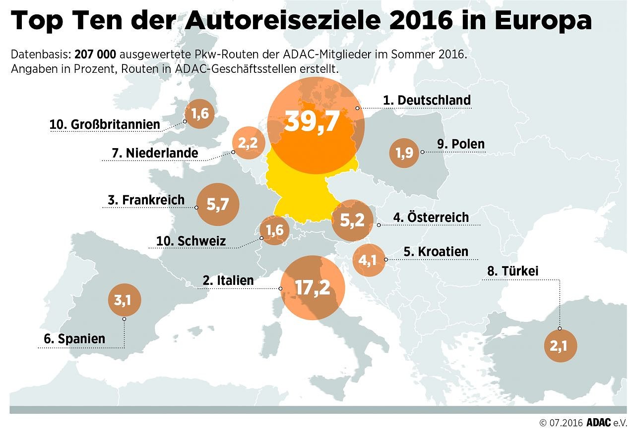 Das eigene Land ist und bleibt das wichtigste Reiseziel der deutschen Autourlauber. Das ergab eine aktuelle Auswertung von 207.000 Routenanfragen von ADAC- Mitgliedern. Spitzenreiter Deutschland erreicht in der Beliebtheitsskala knapp 40 Prozent, gefolgt von Italien mit 17,2 Prozent...