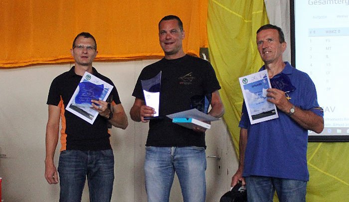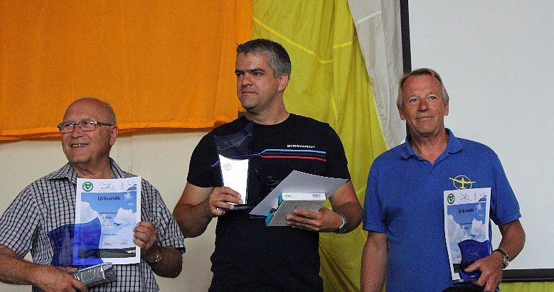 Bei den Langohren, also in der Allgemeinen Klasse hatte Michael Krannich zum dritten Mal in Folge die Nase vorn und durfte somit nicht nur den Siegerpokal sondern auch den Wanderpokal für immer in Empfang nehmen. Das schaffte vor ihm in der 25-jährigen Meisterschaftsgeschichte des Landes Thüringen nur sein hartnäckigster Verfolger Jürgen Kriese. Der siegte in den Jahren 2003, 2004 und 2005 ebenfalls 3 x hintereinander und darf seitdem einen Wanderpokal sein Eigen nennen. Und der 76-jährige Altmeister Jürgen Kriese war es auch, der sich mit Michael Krannich ein spannendes fliegerisches Duell lieferte und dem Jüngeren mit 190 Punkten Vorsprung doch den Sieg überlassen musste. Damit ist schon klar, Platz 2 beanspruchte Jürgen Kriese für sich. Auf den dritten Platz segelte mit seinem Ventus Dr. Manfred Materne aus Bad Berka.