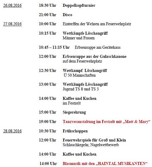 die Freiwillige Feuerwehr feiert vom 26.08. bis 28.08.2016 ihr 147-jähriges Bestehen und das 22. Feuerwehrfest. Wir möchten Sie alle dazu einladen und würden uns freuen, wenn Sie durch Ihre Anwesenheit das Fest auf dem Feuerwehrplatz und im Festzelt bereichern.