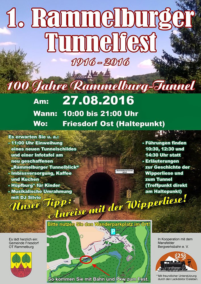 Der blaue Esslinger Triebwagen, im Volksmund liebevoll Wipperliese genannt, bringt heute nur noch am Wochenende oder an Feiertagen Fahrgäste in den Harz und zurück. Sie scheint ein wenig aus der Zeit gefallen, wie sie so bedächtig über das historische Hasselbach-Viadukt, an den Vatteröder Teichen vorbei und durch den 287 Meter langen Tunnel unter der Rammelburg bis ins Harzörtchen Wippra tuckert. Dieser gebogene Tunnel feiert in diesem Jahr seinen 100sten Geburtstag. Anlässlich des Jubiläums lädt die Gemeinde Friesdorf OT Rammelburg in Kooperation mit dem Mansfelder Bergwerks-