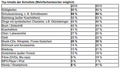 Aber es gibt auch überaus spendable Eltern. So geben in Baden-Württemberg immerhin drei Prozent über 200 Euro für die Schultüte aus und in Thüringen investieren die Eltern jedes siebten Erstklässlers (14 Prozent) 150 bis 200 Euro in die Zuckertüte samt Inhalt. Mit durchschnittlichen Ausgaben von 80 Euro pro Schultüte liegt Thüringen im Bundesvergleich sogar an der Spitze.