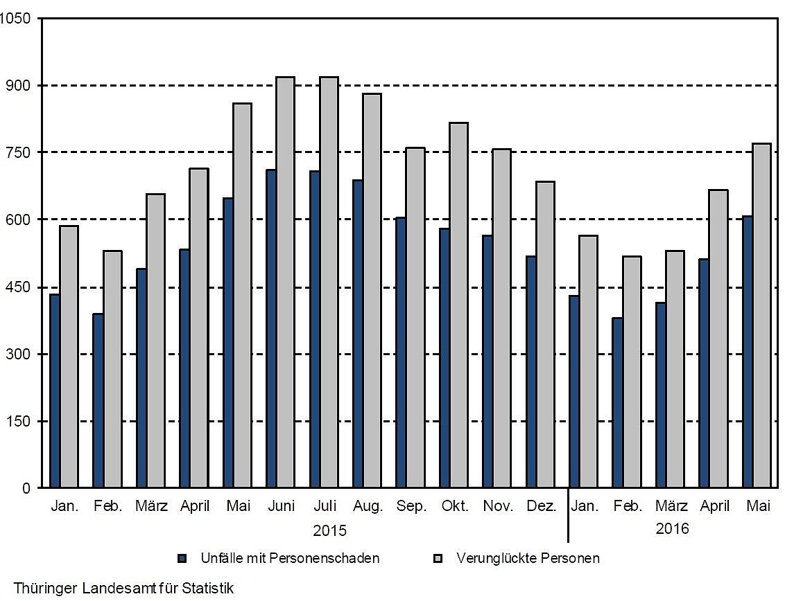 Die Zahl der Unfälle mit Personenschaden verminderte sich von 649 im Mai 2015 auf 607 im Mai 2016. Dabei verunglückten 771 Personen, 5 wurden getötet und 766 wurden verletzt. In den Monaten Januar bis Mai 2016 erfasste die Thüringer Polizei 22 391 Straßenverkehrsunfälle.