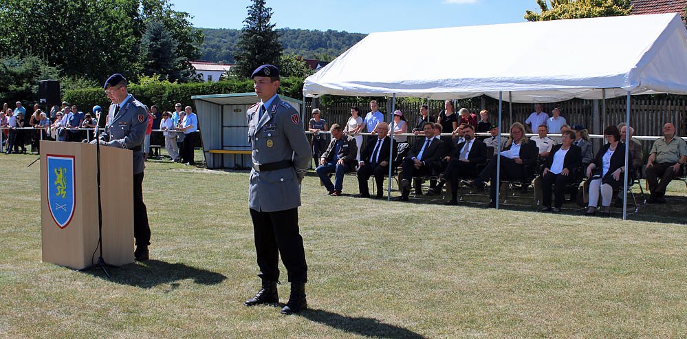 Zu Soldatinnen und Soldaten sagt Oberstleutnant Schreiter, Sie bekunden mit Ihrem Eid die Treue zur Bundesrepublik Deutschland. Sie haben sich dafür entschieden mit diesem Eid auch Führungsverantwortung zu übernehmen, als sie am 4. Juli erstmals durch das Kasernentor in Sondershausen schritten.