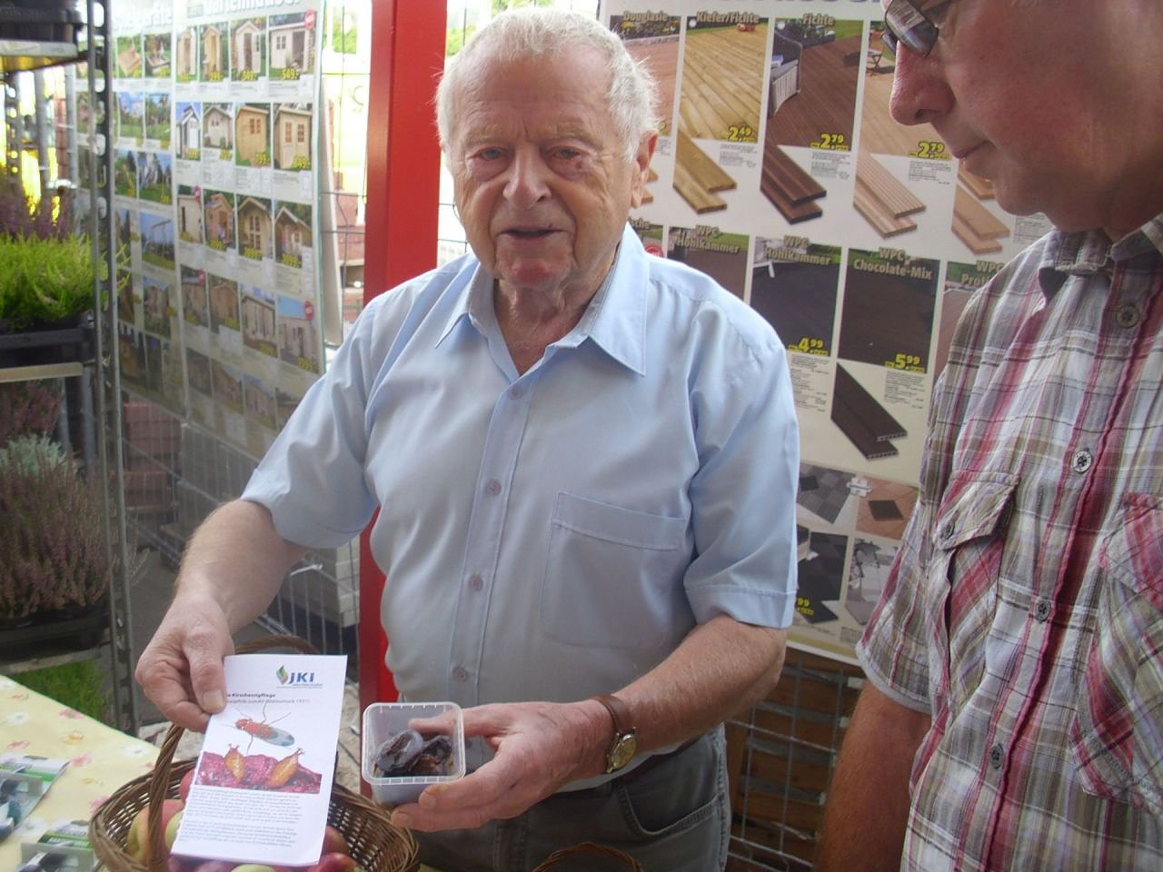 Heinz Wagner gab den zahlreichen Besuchern wertvolle Tipps zu Anbau, Pflege, Pflanzenschutz, Ernte, Lagerung und Verwertung. Natürlich hatte er auch Beispiele zu Befall und Krankheiten, sowie den sichtbaren Krankheitsbildern mitgebracht, wie Zweige der Brombeere, die mit Gallmilben besetzt sind. Eine befallene Probe mit der Kirschfruchtessigfliege hatte er auch mitgebracht. Anhand des Infoblattes zu dieser Fliegenart und der befallenen Pflaume – ja, Sie haben richtig gelesen – es werden nicht nur die Kirschen befallen konnte er direkt am lebenden Objekt den Befall präsentieren.