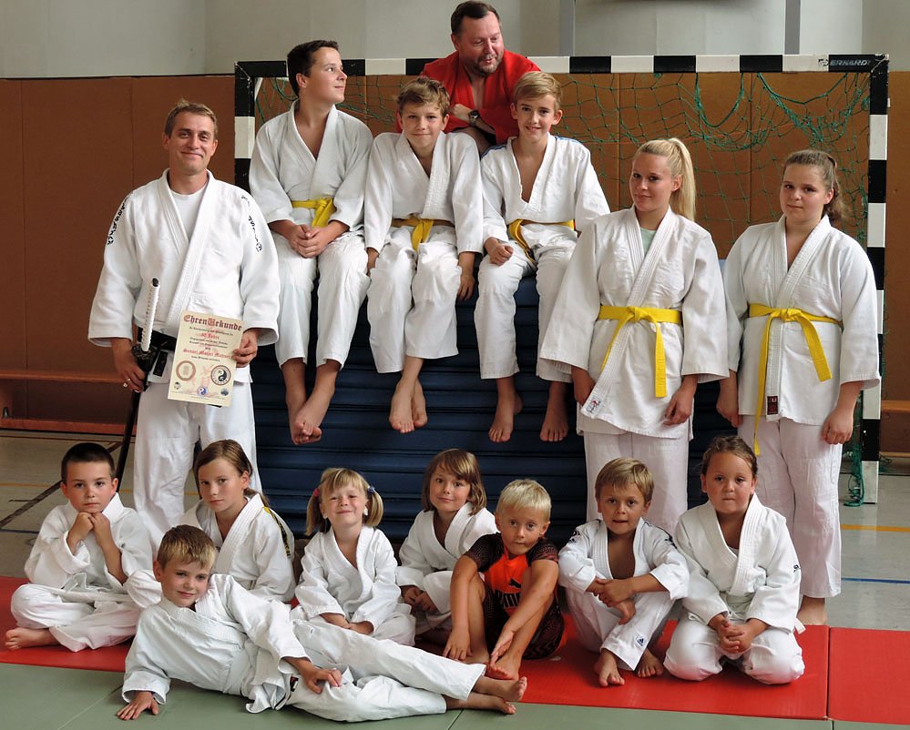 Marcel Mahner- im weißen Judogi- in Mitten seiner Trainingsgruppe