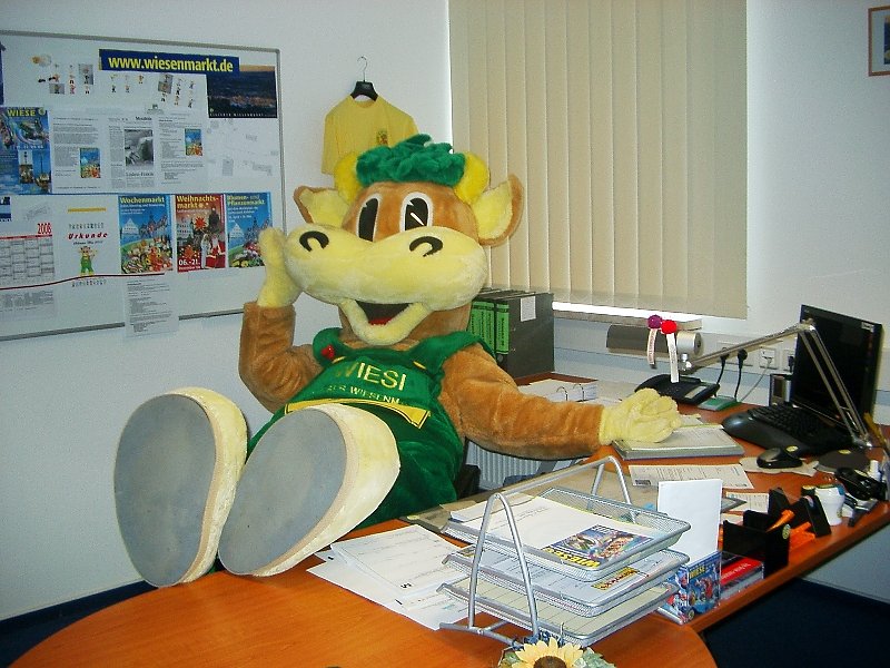 Bis zum Start macht Maskottchen Wiesi im schattigen Marktmeisterbüro noch eine Verschnaufpause. (Foto/Wiesenmarkt)