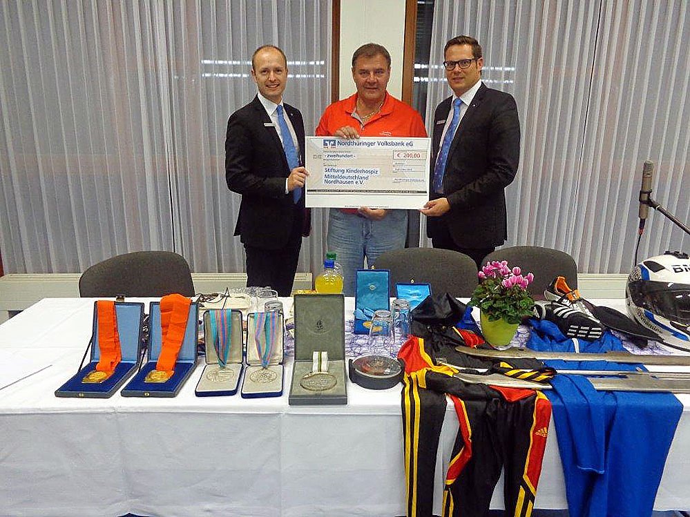 Bürgermeister Uwe Vogt würdigte das ehrenamtliche Engagement von Wolfgang Hoppe, der nicht nur ein Idol und Vorbild für die Sportjugend ist, sondern er ist u.a. Botschafter der Stiftung Kinderhospiz Mitteldeutschland in Tambach- Dietharz oder Mitorganisator der Regenbogentour zugunsten der Elterninitiative leukämie- und tumorkranker Kinder in Thüringen. Herr Hoppe verzichtete auf seine Gage zugunsten des Kinderhospizes. Hierfür bekam er einen Scheck von der Nordthüringer Volksbank durch den Ebelebener Bereichsleiter Michael Hartmann und seinem Nordhäuser Kollegen Sven Bäger überreicht. Viele Gäste nutzten die Lesung, um dieses Anliegen in Form einer Spende zu unterstützen. Natürlich signierte Herr Hoppe auch noch Autogrammkarten.
