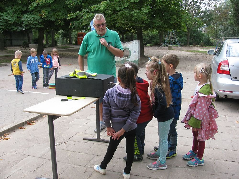 Als weitere Station kam die Blackbox zum Einsatz. Dabei wurde den Kindern aufgezeigt, wie wichtig rechtzeitige Erkennbarkeit, insbesondere der zur Zeit beginnenden dunklen Jahreszeit ist. Es wurde die Zweckbestimmung von Sicherheitswesten, Reflektoren und der richtigen Bekleidung aufgezeigt. Nach Abschluss der Station wurden den Kindern Blinkis, zum Umhängen bzw. zum Befestigen an der Oberbekleidung ausgegeben.