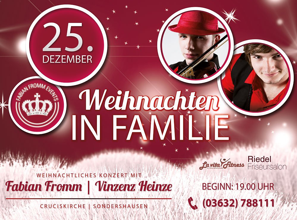 Gemeinsam mit Vinzenz Heinze, der vielen als Pianist der Band Annred” ein Begriff sein dürfte, lädt Sie Fabian Fromm herzlich ein. Musik aus Klassik, Pop & Rock. Musik aus den bekanntesten Filmen unserer Zeit – von Forrest Gump” bis hin zur Titanic”. Und natürlich die besten Melodien zur Weihnachtszeit – insbesondere des Titels Weihnachten in Familie” von Frank Schöbel.