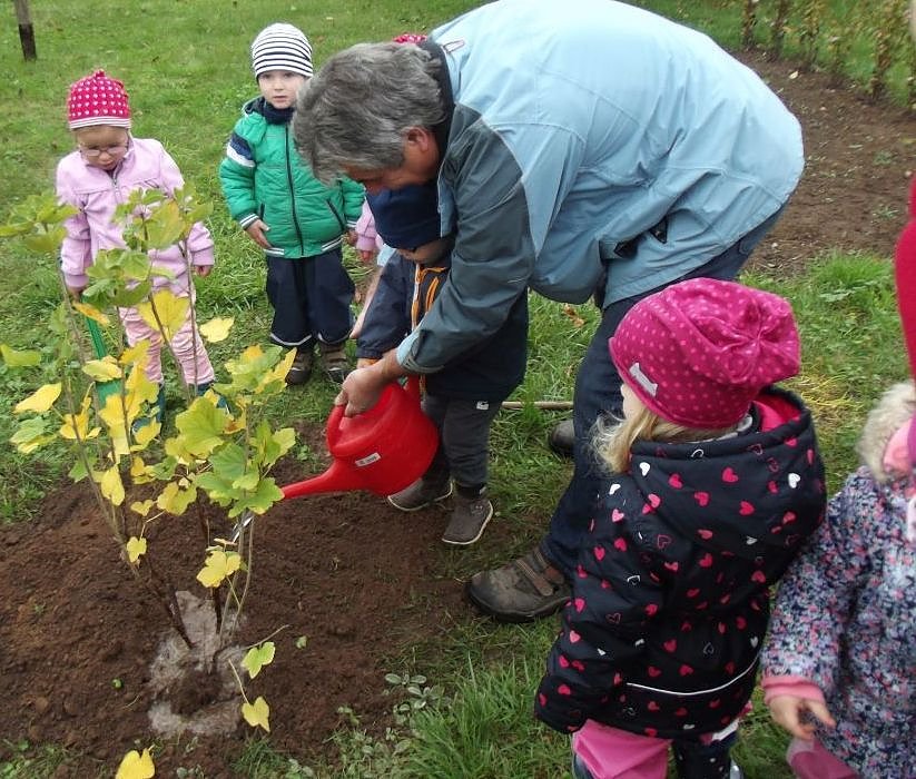 Die beiden Betreuerinnen der Arche Noah hatten die Kinder bereits vorinformiert und auf diesen Besuch im Garten vorbereitet und so konnten die Kinder Wolfgang Dittrich bei der kurzen Begrüßung auch schon genau Antwort geben, was man heute hier tun wolle. Die Gartenfreunde Buddrus hatten am Vortag schon Pflanzlöcher vorbereitet, das war auch gut so, denn trotz Regens ist der Boden bereits in geringer Tiefe noch immer sehr hart und lässt sich nicht leicht graben.