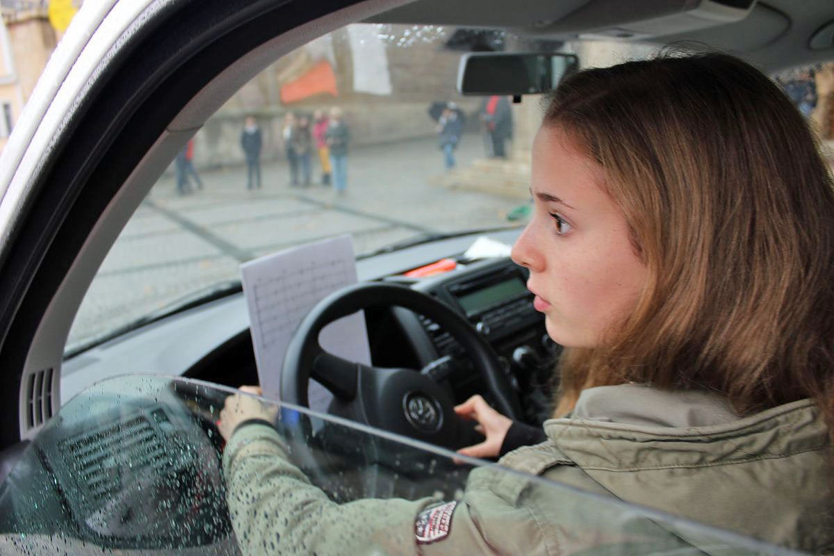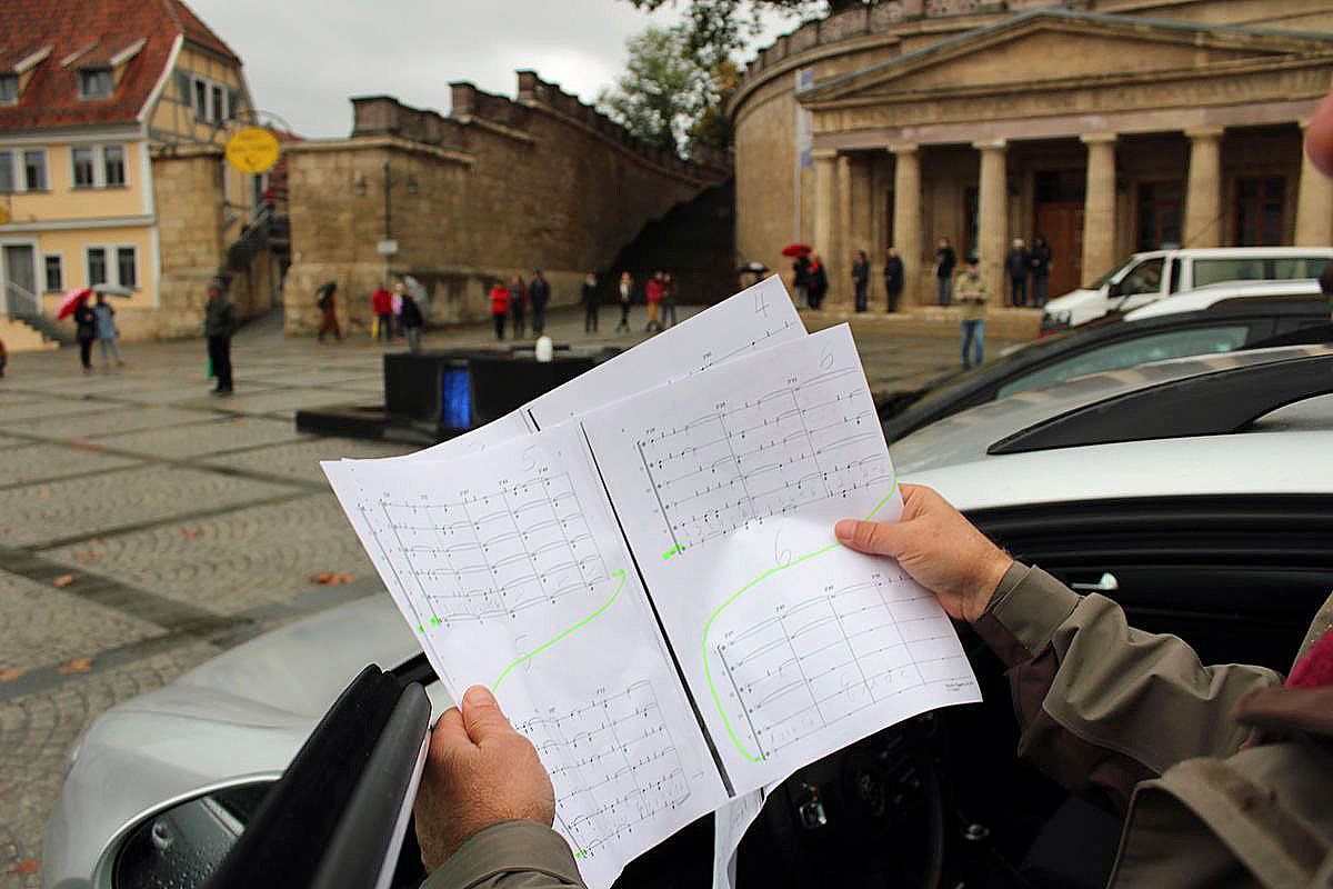Dann kam aber der große Auftritt von Dirigent Juri Lebedev (sonst dirigiert er das Landesjugendorchester). Es nannte sich Open-Air-Performance Glückauf für sechs Autohupen und mit Musikerinnen und Musikern des Landesjugendensemble Neue Musik Thüringen und Jugend-komponiert-Teilnehmern.
