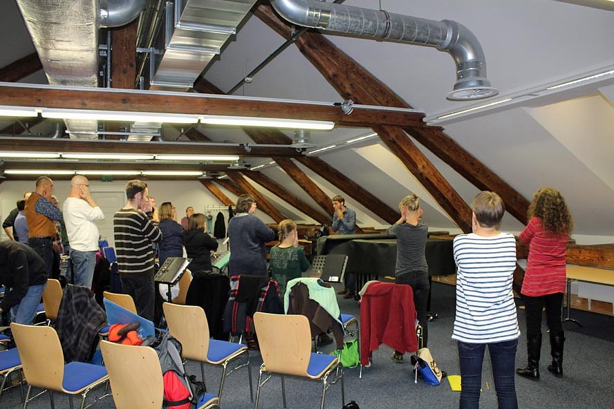 Bei dem Konzert in Sondershausen wird Arman rund 100 Sängerinnen und Sänger von drei Chören dirigieren. Es sind u.a. die Hallenser Madrigalisten, die hier kn bei der Probe erwischte. Dabei gehören offensichtlich auch Entspannungsübungen dazu.