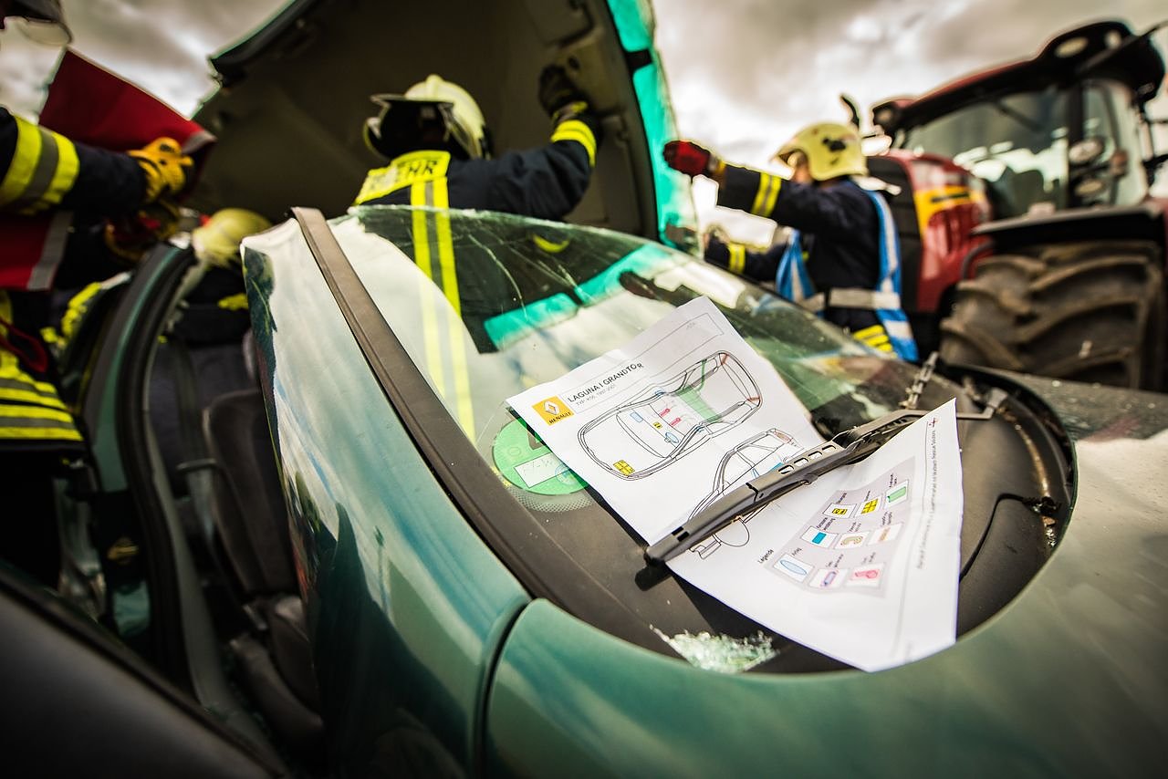 Rettungsgasse, Rettungskarte: Die Rettungskarte ist ein wichtiges Hilfsmittel für die Feuerwehr beim Freischneiden von Unfallopfern aus dem Fahrzeug.