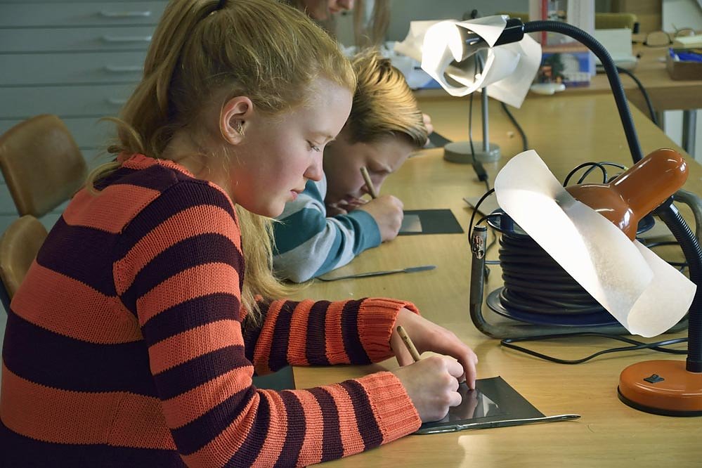 Am Ende wurde die Zeit sogar knapp und sie mussten sich beim Drucken ihrer Radierungen sehr beeilen. Natürlich ist dieser Moment, wenn man die Platte mit Farbe eingerieben und dann die Farbe wieder von den unbearbeiteten Flächen mehr oder weniger gekonnt entfernt und sie dann bedeckt mit einem weichen Büttenpapier durch die Radierpresse gezogen hat, überaus spannend, denn erst jetzt kann man das Resultat seiner Bemühungen richtig würdigen. Für jemanden, der erstmals auf diese Art und Weise Bilder macht, ist das Ganze sicher sehr faszinierend.