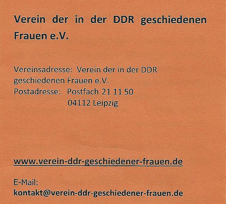 Der Verein der in der DDR geschiedenen Frauen e. V. will auf die Schicksale der Betroffenen aufmerksam machen. Noch immer kämpfen diese Frauen gegen das Unrecht, keinerlei Ansprüche auf Versorgungsausgleich in ihren Ehejahren gegenüber ihrem Partner erworben zu haben, an. Der Einigungsvertrag sah keine Angleichungen im Rentenüberleitungsgesetz dafür vor. Altersarmut ist oft die Folge. Zahlreiche Fraueninitiativen haben sich gegen diese Diskriminierung gewehrt und tun dies immer noch.