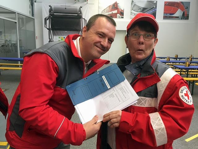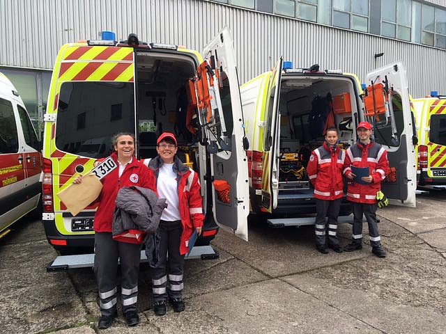 Nach einer kurzen Begrüßung und Einweisung auf dem Gelände der Firma BINZ war es dann soweit, wir bekamen Schlüssel und Papiere für unsere zwei nagelneuen Mercedes Benz Sprinter KTW ausgehändigt. Nun war Fleißarbeit angesagt, denn anhand seitenlanger Übergabelisten mussten beide Fahrzeuge auf Vollständigkeit geprüft werden.