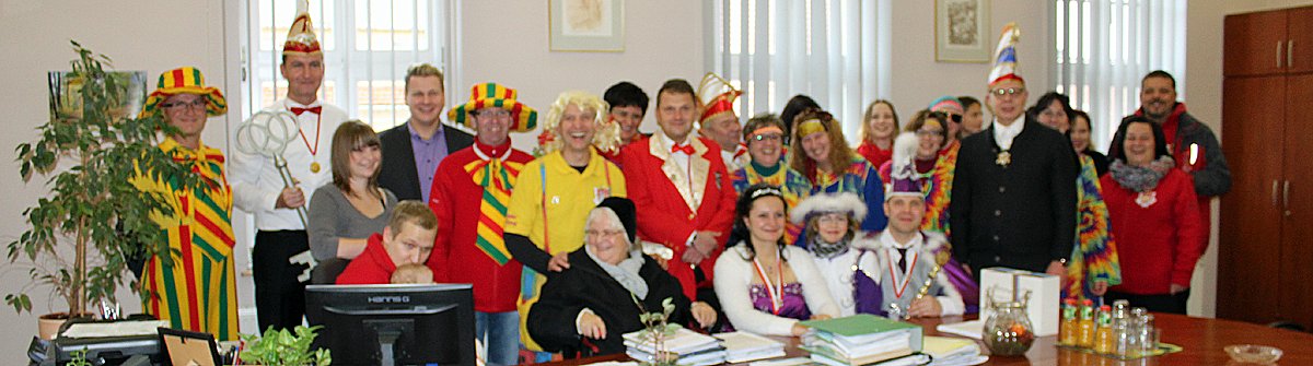 Närrinen und Narren waren ihrem Präsidenten schon abtrünnig geworden und huldigten dem neuen Chef im Rathaus, den hier Margitta Behrend schon hofiert, der wie man sieht auch schon fest im Sattel, sprich Schoß, sitzt. Da dürften Lobodasch und Strejc keine Chance mehr haben. Damit der Namen nicht gleich bei der NSE registriert wird, wurde der Name des Kleinen noch nicht öffentlich gemacht.
