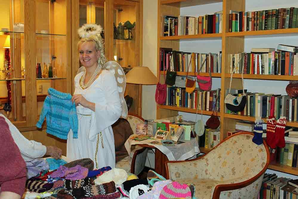 Der Weihnachtsengel verkauft Strickwaren, die von den Bewohnern in der Seniorenresidenz gestrickt wurden.