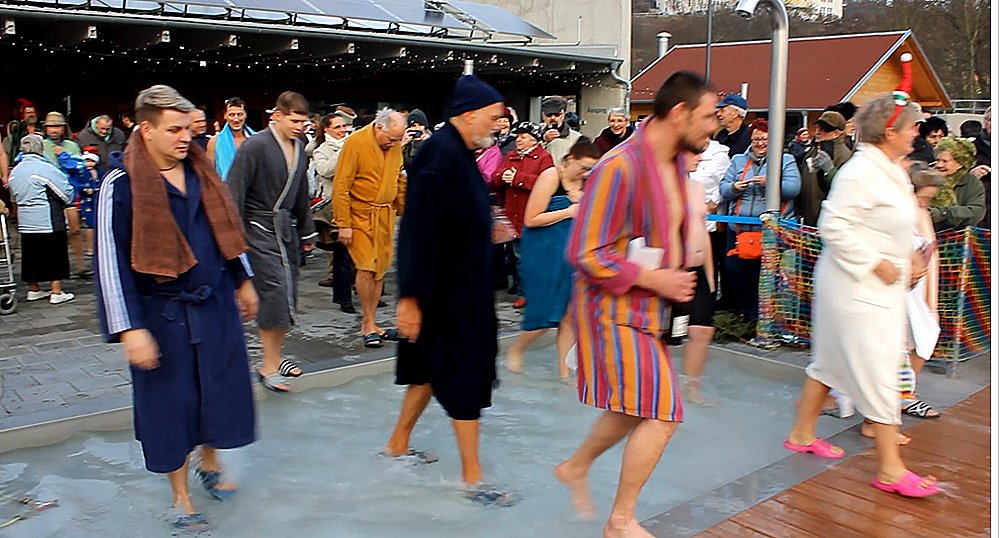 Dann aber wurde es spannend. Die 53 mutigen Frauen, Männer und Jugendlichen (später kamen noch einige hinzu) betraten die Bühne des Geschehens und näherten sich aus der Umkleidekabine dem Becken mit der 3,5 prozentigen Sole. Das Wasser würde allerdings nicht bei Null Grad gefrieren.