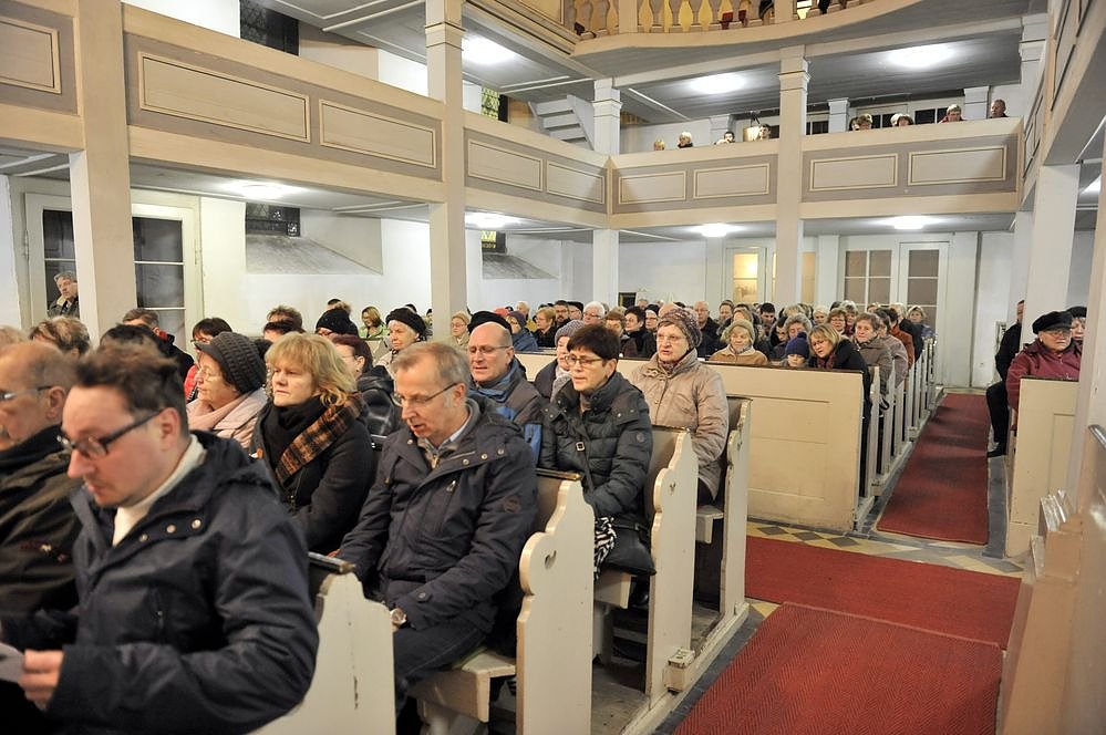 Dem folgten vom gesamten Klangkörper dargeboten weitere Liedbeiträge aus verschiedenen Jahrhunderten. Für Abwechslung sorgten Instrumentalbeiträge von Daniela Wesche (Querflöte), Kay Bordich (Klavier) sowie Sabine und Florian Kühne (Violine / Klavier). Auch das Publikum kam unter Begleitung des Organisten Jürgen Hartung zum Einsatz.