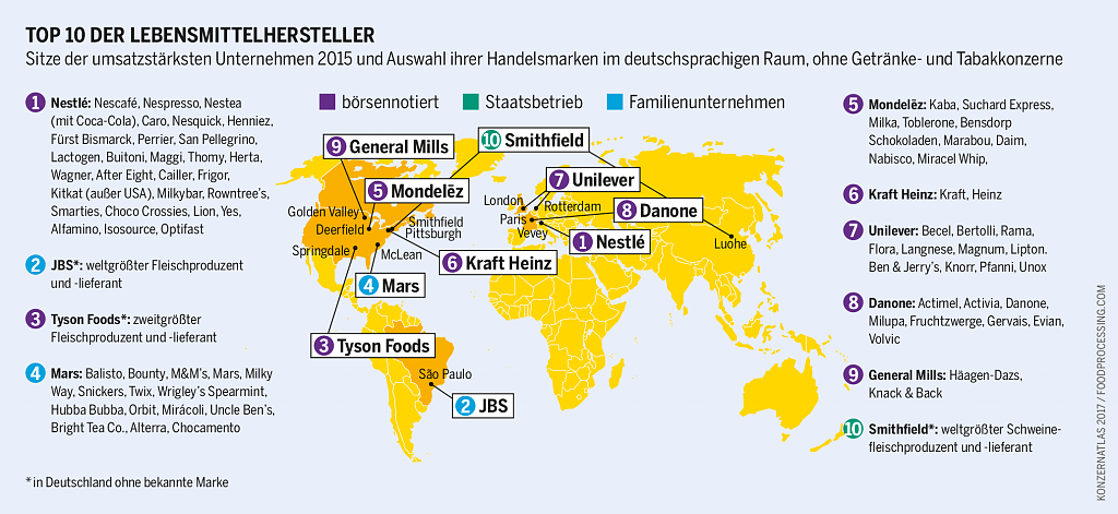 Wegen der vielen regionalen Hersteller ist der Weltmarkt für verarbeitete Lebensmittel noch nicht so stark konzentriert wie der Handel mit Agrarrohstoffen, Saatgut oder Pestiziden. Die 50 größten Lebensmittelkonzerne erwirtschaften 50 Prozent des weltweiten Umsatzes in der Branche; dabei verzeichnen die größten Konzerne die meisten Zuwächse. Diese Entwicklung wird sich so fortsetzen. Mit der Globalisierung der Ernährungssysteme und der Expansion der Multis mit ihrer Vielzahl von Produkten verändern sich die Essgewohnheiten, nicht nur im Norden, sondern auch in Schwellen- und Entwicklungsländern. Die wenig verarbeiteten Lebensmittel werden durch hochgradig verarbeitete ersetzt, auch durch Fertiggerichte wie Pizzen, Suppen und Menüs.
