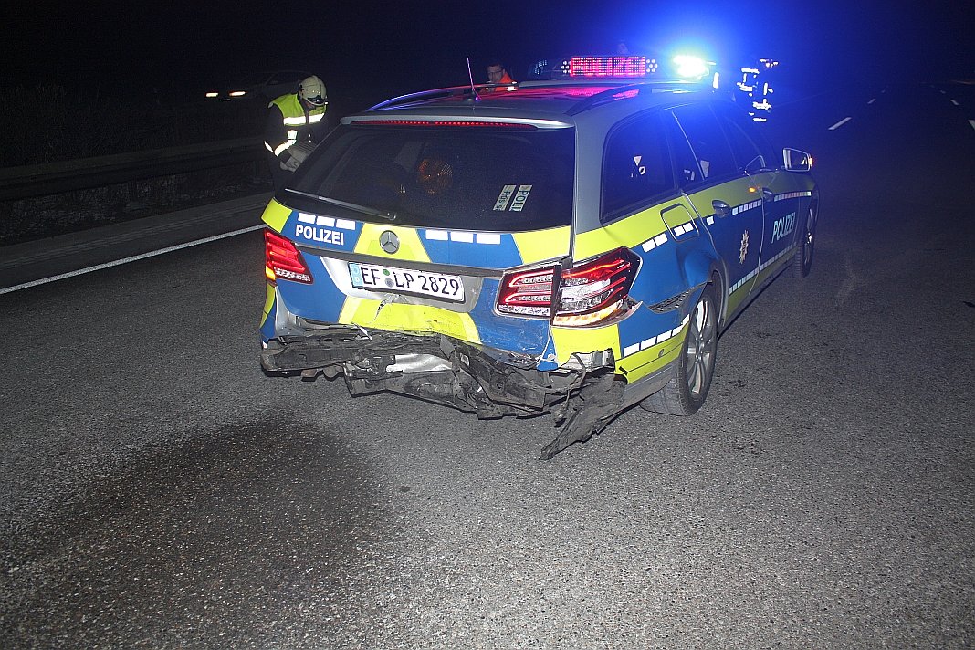 Die Autobahnpolizei war kurze Zeit später vor Ort und wollte die Gefahrenstelle sichern, denn der verunfallte Hyundai stand gefährlich am Ende einer Linkskurve auf dem linken Fahrstreifen. Der Streifenwagen wollte sich gerade hinter dem Unfallauto positionieren, als ein 18-jähriger Pkw- Fahrer aus Gera frontal auf den Streifenwagen auffuhr. Offenbar war der Mann trotz im Dunkeln gut erkennbarem Blaulicht nicht vom Gas gegangen. Sowohl der 49-jährige Fahrer im Steifenwagen, als auch der 18-Jährige wurden bei dem Unfall leicht verletzt.