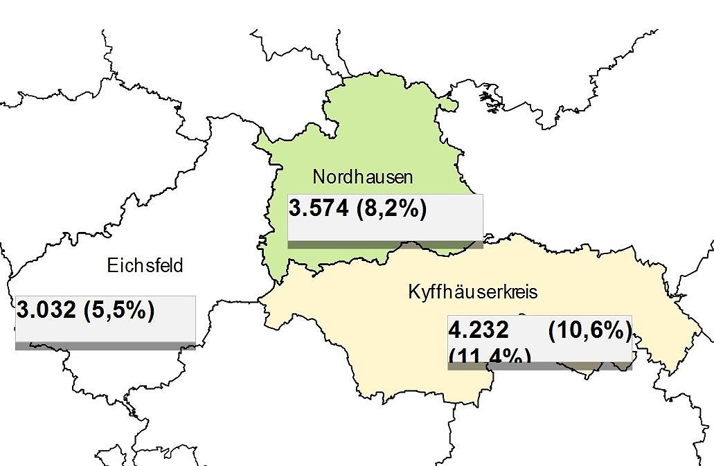 Landkreis NordhausenDie Arbeitslosigkeit ist von Dezember auf Januar um 337 auf 3.574 Personen gestiegen. Das waren 541 Arbeitslose weniger als vor einem Jahr. Die Arbeitslosenquote auf Basis aller zivilen Erwerbspersonen betrug im Januar 8,2%; vor einem Jahr belief sie sich auf 9,3%. Dabei meldeten sich 919 Personen (neu oder erneut) arbeitslos, 326 weniger als vor einem Jahr und gleichzeitig beendeten 579 Personen ihre Arbeitslosigkeit (–309). Der Bestand an Arbeitsstellen ist im Januar um 64 Stellen auf 335 gestiegen; im Vergleich zum Vorjahresmonat gab es 10 Arbeitsstellen mehr. Arbeitgeber meldeten im Januar 165 neue Arbeitsstellen, 38 mehr als vor einem Jahr.