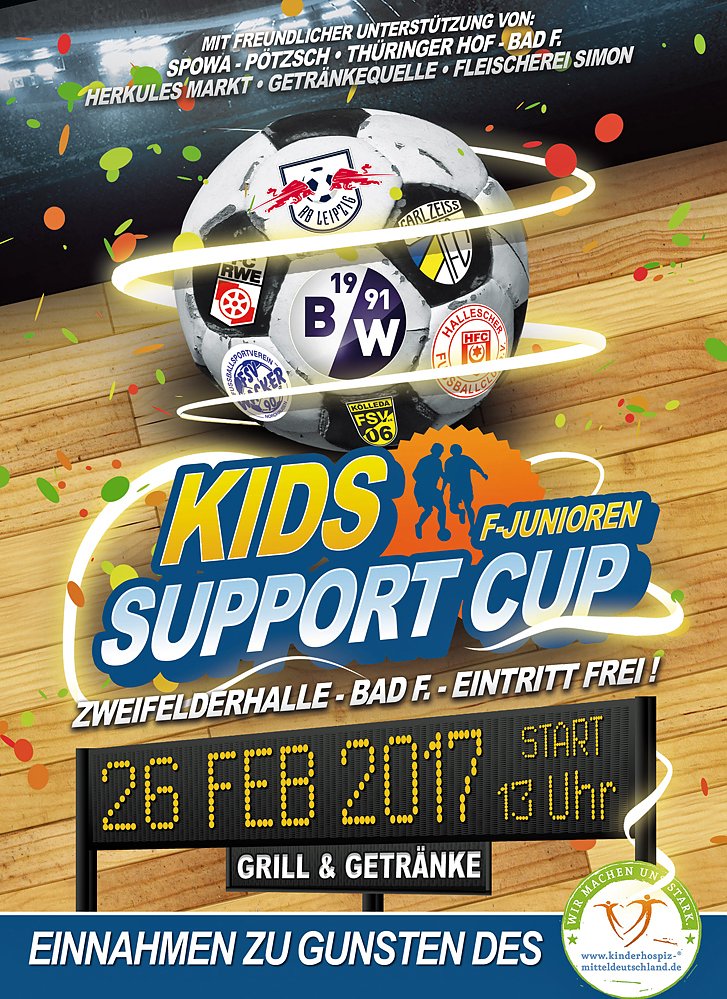 Autor: khhAm 26.02.2016 findet der 1. "Kids-Support-Cup" der F-Junioren in der Zweifelderhalle in Bad Frankenhausen statt. Beginn des Benefizturnieres zu Gunsten des Kinderhospiz Mitteldeutschland wird 13 Uhr sein. Nachdem die Teams durch den Hallensprecher einzeln vorgestellt wurden und der Frankenhäuser Fanfarenzug das Turnier offiziell eröffnet hat, werden in 2 Gruppen zu je 4 Mannschaften die Finalgegner ausgespielt.