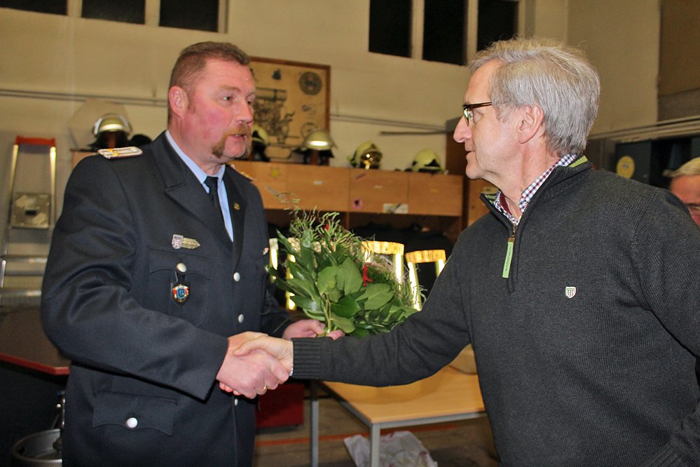 Dann wurde bei der FFW Stocksen gewählt. Alter und neuer Wehrleiter ist Mike Grambs, der hier die Glückwünsche von Manfred Kucksch entgegen nahm.