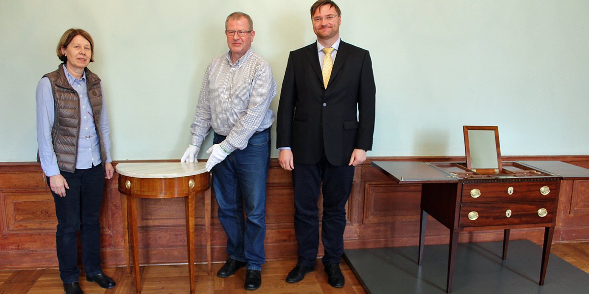 Museumsleiterin Christa Hirschler,Peter Atzig und der Vorsitzende des Fördervereins Stefan Schard präsentieren zusammen mit die kostbaren Möbelstücke.