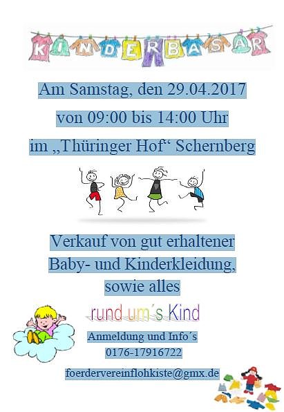 Am Samstag, den 29.04.2017 von 09:00 bis 14:00 Uhr im Thüringer Hof Schernberg findet der Verkauf von gut erhaltener Baby- und Kinderkleidung, sowie alles rund ums Kind statt.Anmeldung und Info´s 0176-17916722