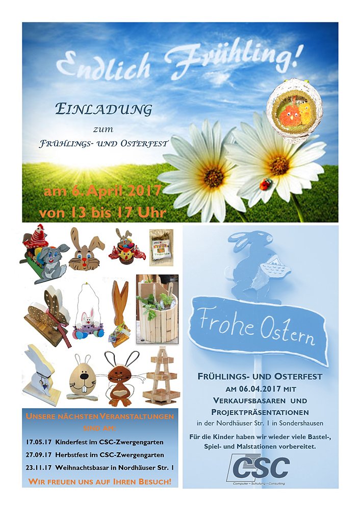 Morgen findet bei der CSC Computer-Schulung & Consulting GmbH Sondershausen in der Nordhäuser Straße 1 ein Frühlings- und Osterfest statt. Wir laden alle Interessierten recht herzlich ein, so CSC gegenüber kn!...