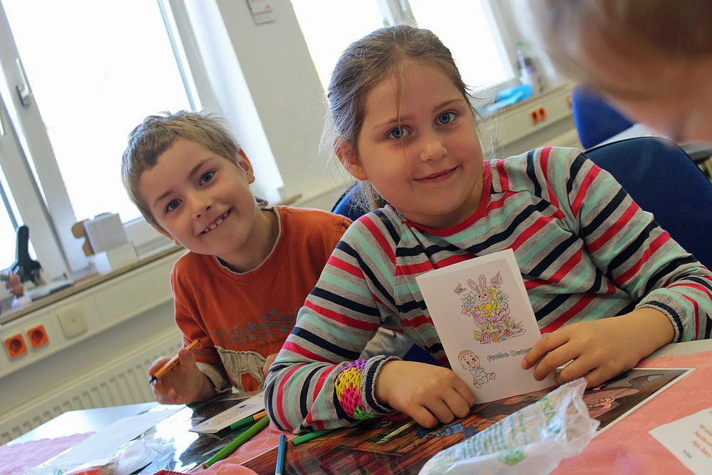 Damit nicht alle Kinder auf einmal die Räume stürmten, hatte man nicht nur gestaffelt eingeladen, sondern es wurde "generalstabsmäßig) organisiert, damit jedes Kinddie Gelegenheit hatte, an jeder Stelle zu basteln. Als kn kam, waren gerade die Kinder der Käthe-Kollwitz-Schule (2. und 4. Klasse) aktiv. Nach dem Mittagessen kamen die Klassen 1 und 3 dran.