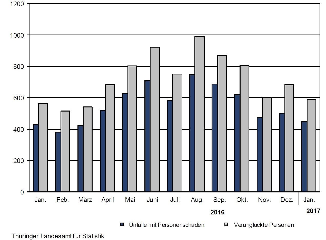 Von der Thüringer Polizei wurden im ersten Monat des Jahres nach vorläufigen Ergebnissen des Thüringer Landesamtes für Statistik 4 900 Unfälle aufgenommen. Nach Mitteilung des Thüringer Landesamtes für Statistik waren es 456 Unfälle oder 10,3 Prozent mehr als im Januar 2016...