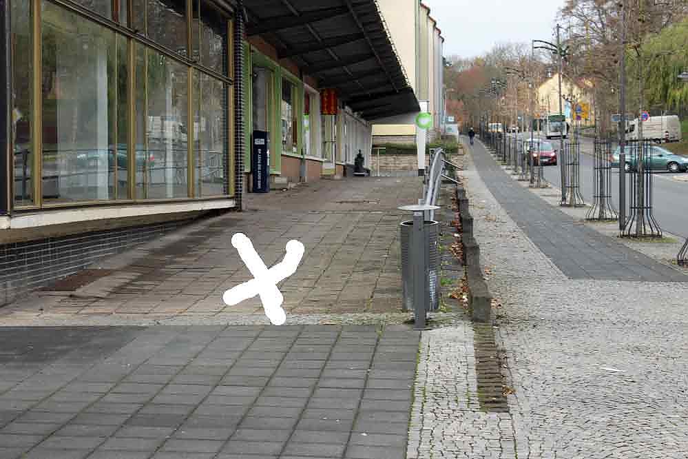 Strittig war bisher noch der hier mit einem Kreuz gekennzeichnete Teil vor den Flachläden, denn die gehören immer noch der Stadt Sondershausen. Es hat sich einige Zeit hingezogen, ehe nun im Stadtrat das grüne Licht für die Stadtverwaltung kam, diesen Teil des Gehwegs an das Unternehmen Rossmann zu verkaufen, um wirklich eine annehmbare Gebäudegröße zu erreichen.