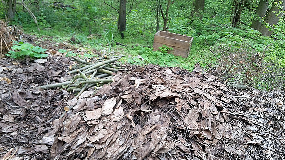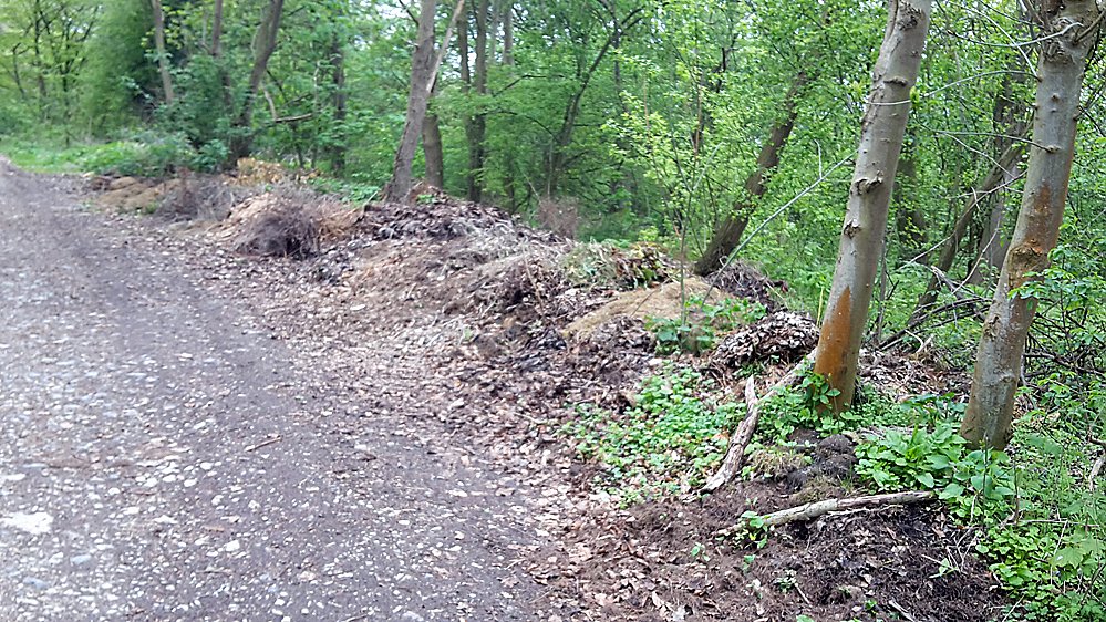 Zwar wurde erst jüngst Müll abgefahren, aber was in den den letzten Jahren sammelt ist der Biomüll. Frei nach dem Motto, im Wald fallen Äste und Laub auf den Boden und verrotten, da kann es doch nicht schaden wenn man sein Laub und den Baumschnitt in den Wald wirft.