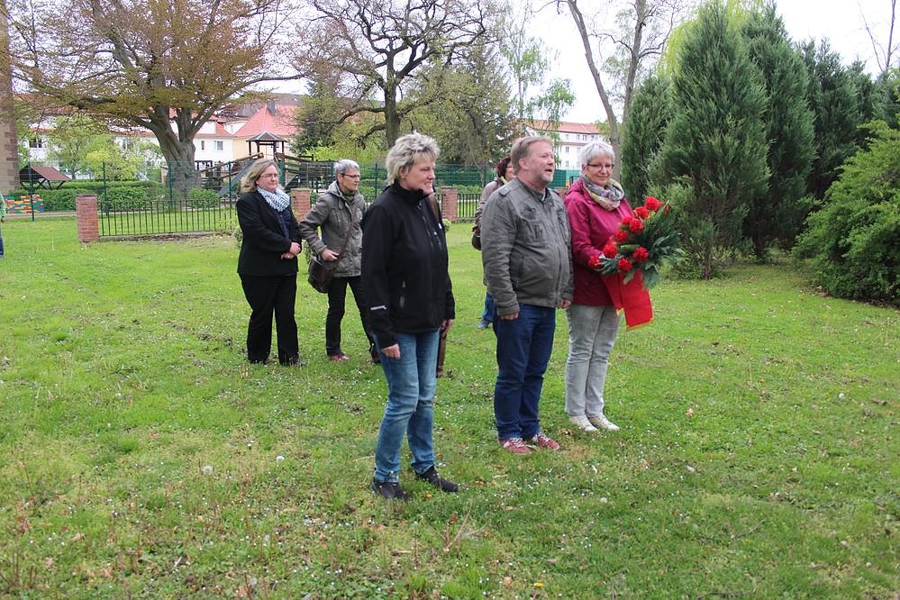 Sigrid Rösner und Angela Trommer legten am Mahnmal ein Gebinde nieder und Angela Trommer und Torsten Blümel auf dem Sowjetischen Friedhof.
