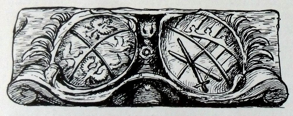 Diese Skizze des Wappensteins aus Ewald Engelhardt Arterner Heimatbuch von 1913 war alleinige Vorlage zur Sanierung. Historische Fotos oder andere Darstellungen des Denkmals lagen nicht leider vor. Zur detailgetreuen Darstellung der Wappen durch den Steinmetz wurden relevante farbige Abbildungen aus Veröffentlichungen zur Heraldik genutzt.