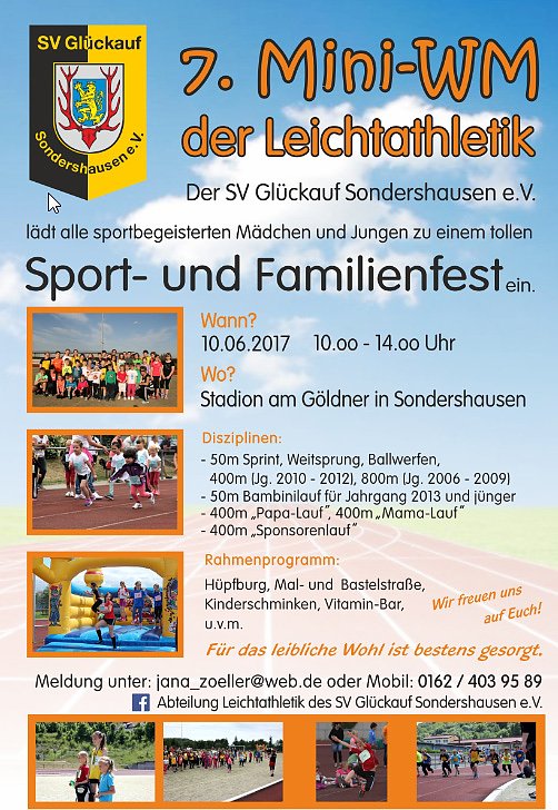 Anmeldungen sich noch möglich. Auf zur 7. Mini-WM der Leichtathletik in Sondershausen unater anderem mit Mama-und-Papa-Lauf. Hier kn mit den Einzelheiten...