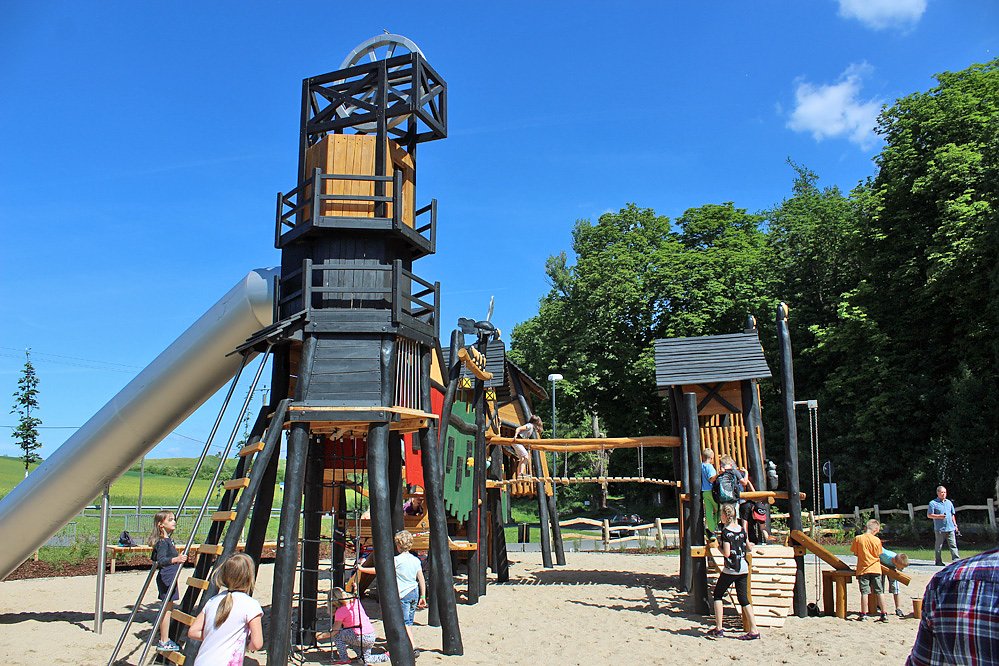 Unter anderem ist eine richtige Bergwerkstadt mit verschiedenen Erlebnis-Bergwerkgängen für die Kinder entstanden. Aber auch viele andere Spiel- und Klettergeräte, viele mit Bezug auf den Bergbau, warten auf die jungen Besucher. So erinnert der Turm für die Rutsche an einen Förderturm im Bergbau.