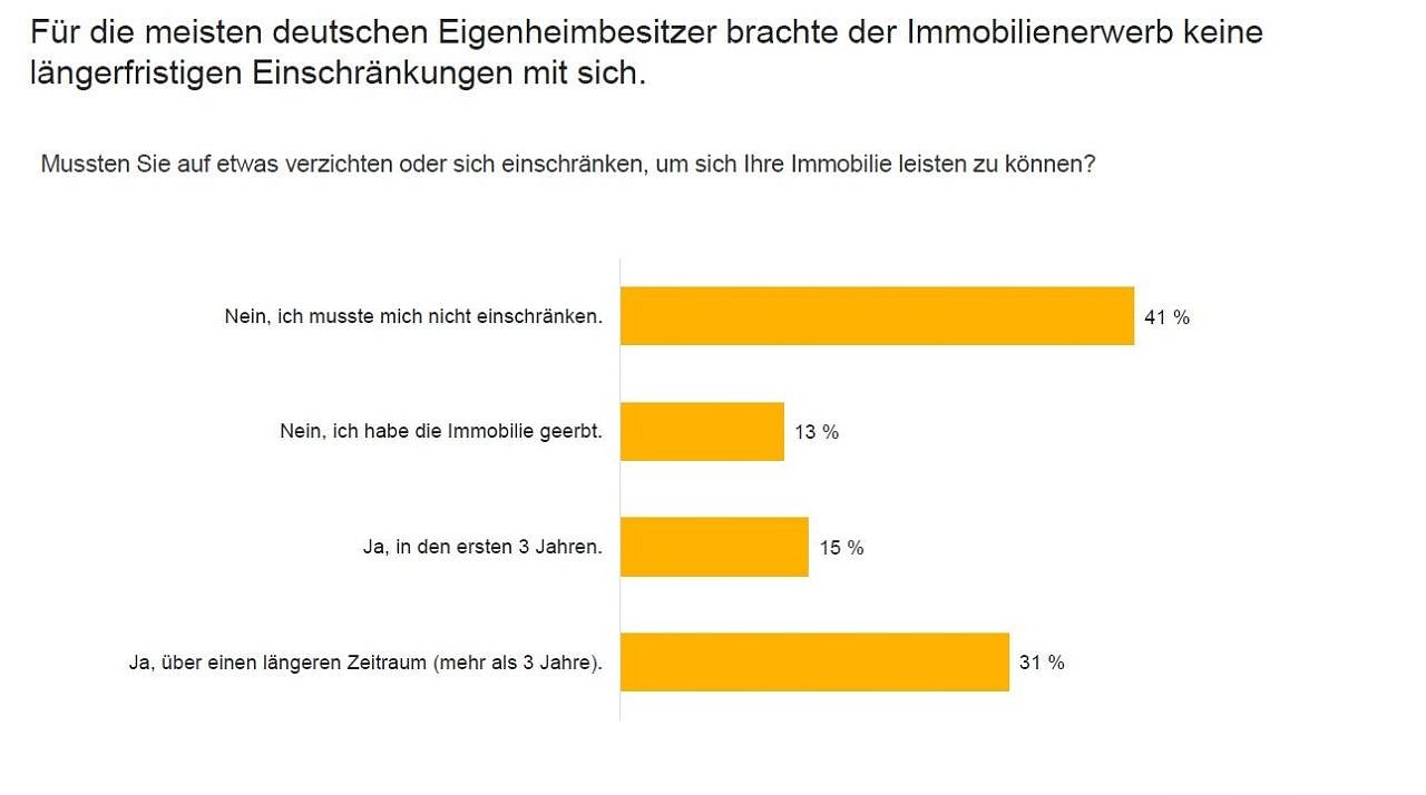 Überhaupt nicht in ihren anderen Lebensbereichen einschränken mussten sich 41 Prozent der Befragten. Nach dem Immobilienkauf war immer noch genügend Geld für das Auto, Urlaubsreisen, Hobbys oder den Restaurantbesuch am Wochenende vorhanden. Weitere 13 Prozent gerieten nicht in Sparzwang, weil sie ihre Immobilie geerbt haben. 15 Prozent der Deutschen mussten zwar in den ersten 3 Jahren nach dem Erwerb des Eigenheims kürzertreten, erlangten danach aber wieder schnell ihre finanzielle Freiheit.