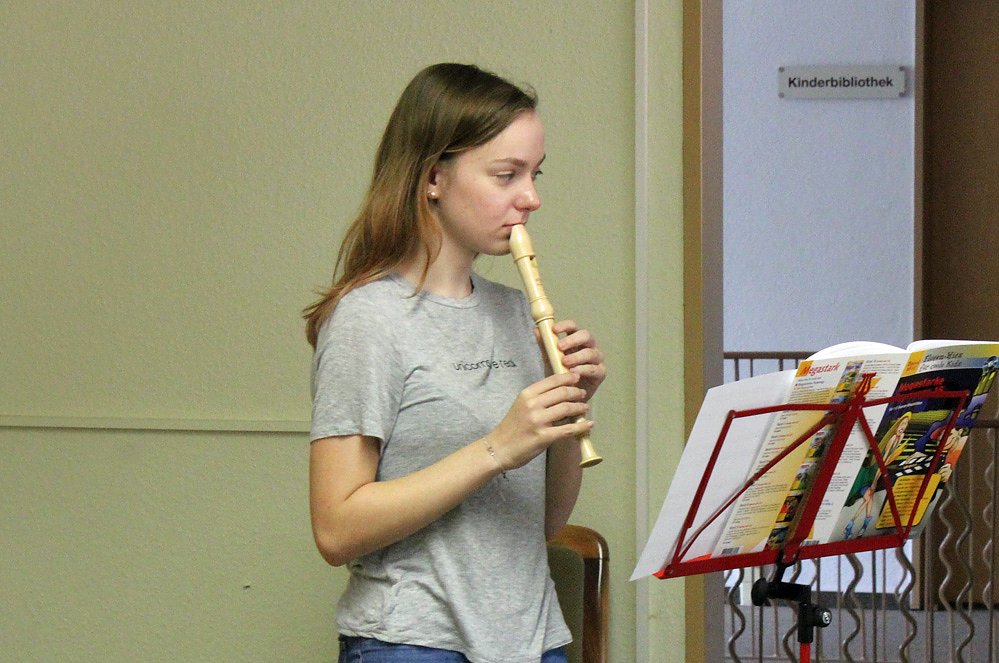 Musikalisch wird ihre Vorlesung dabei begleitet von Josephine Meynburg-Clemens (Großbrüchter) auf der Blockflöte.