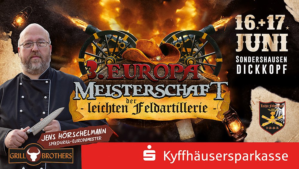 Am 16. und 17. Juni lädt der Verband der Deutschen Schwarzpulverkanoniere (VDSK) zur 3. Europameisterschaft der leichten Feldartillerie nach Sondershausen ein. Die Wettkämpfe beginnen bereits am Donnerstag. Die Schießzeiten sind am Donnerstag von 17:00 bis 20:00 Uhr, am Freitag von 8:00 bis 14:00 Uhr und am Samstag von 8:00 bis 10:40 Uhr und 11:30 bis 13:00 Uhr.