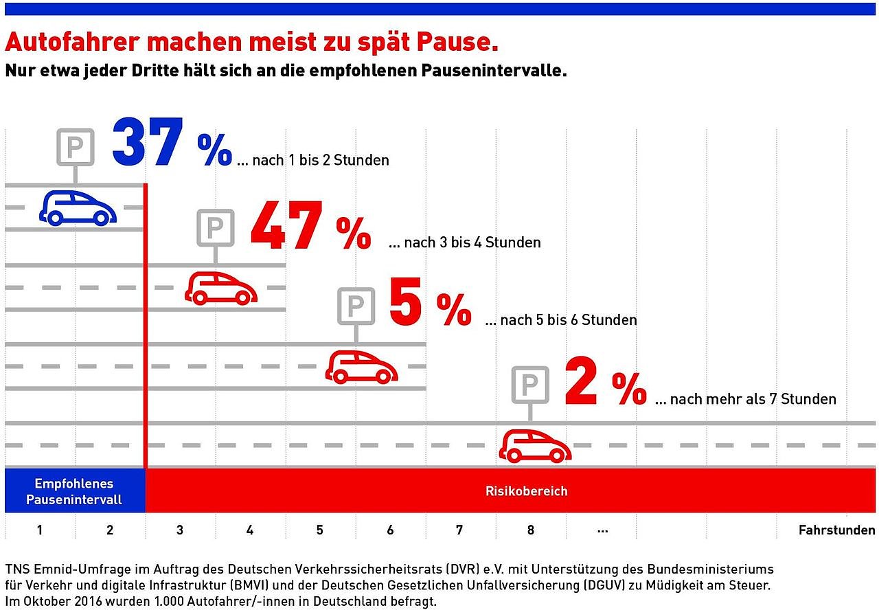 Laut einer im Oktober 2016 vom Deutschen Verkehrssicherheitsrat (DVR) beauftragten TNS-Emnid-Umfrage hält sich nur etwa jeder Dritte der befragten Fahrer und Fahrerinnen an das empfohlene Pausenintervall und pausiert nach circa zwei Stunden. Über 50 Prozent legen erst nach drei bis vier Stunden oder später eine Pause ein. In diesem Fall steigt die Gefahr für Müdigkeit am Steuer – ein häufig unterschätztes Risiko.