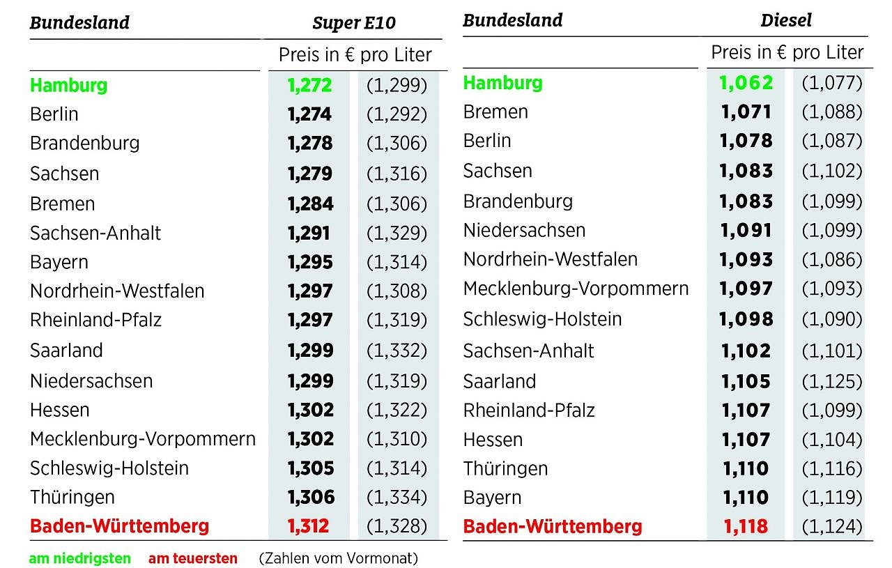 Am teuersten ist es aktuell in Baden-Württemberg. Ein Liter E10 schlägt hier im Durchschnitt mit 1,312 Euro zu Buche. Für einen Liter Diesel ist 1,118 Euro fällig.