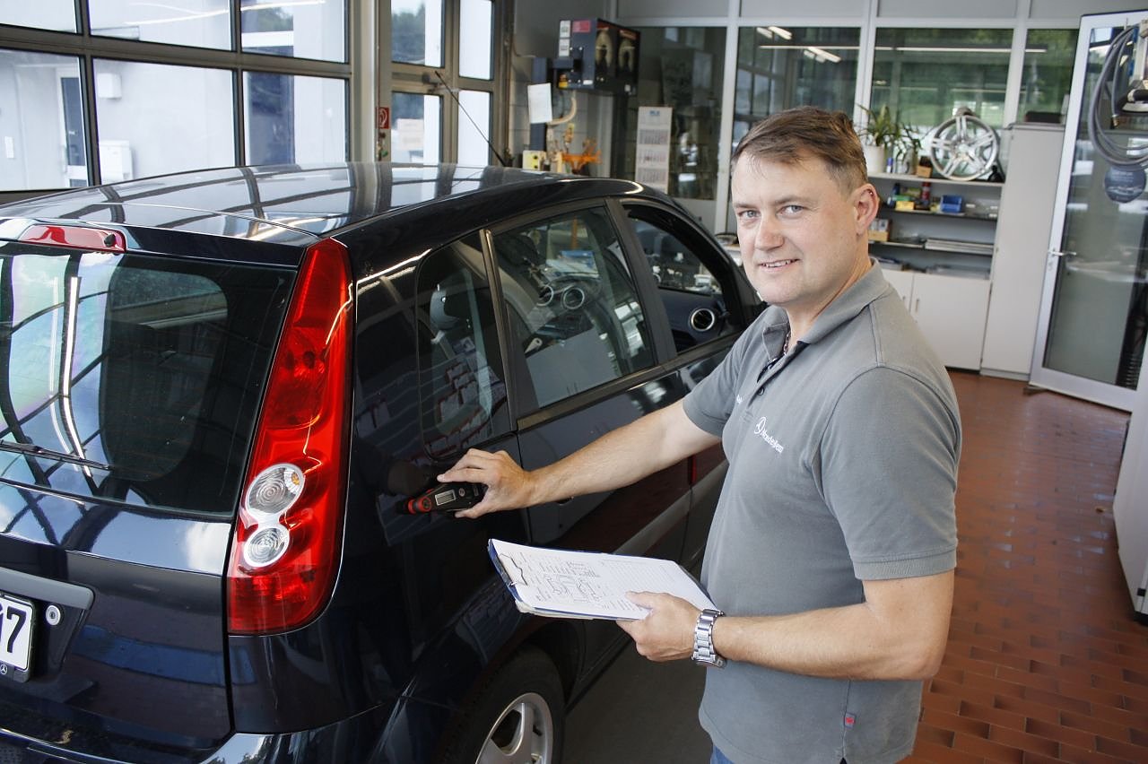 Fahrzeuggutachter Maik Zehnpfund überprüft ein Fahrzeug für den Ankauf. Dabei misst er unter anderem auch die Lackdichte.