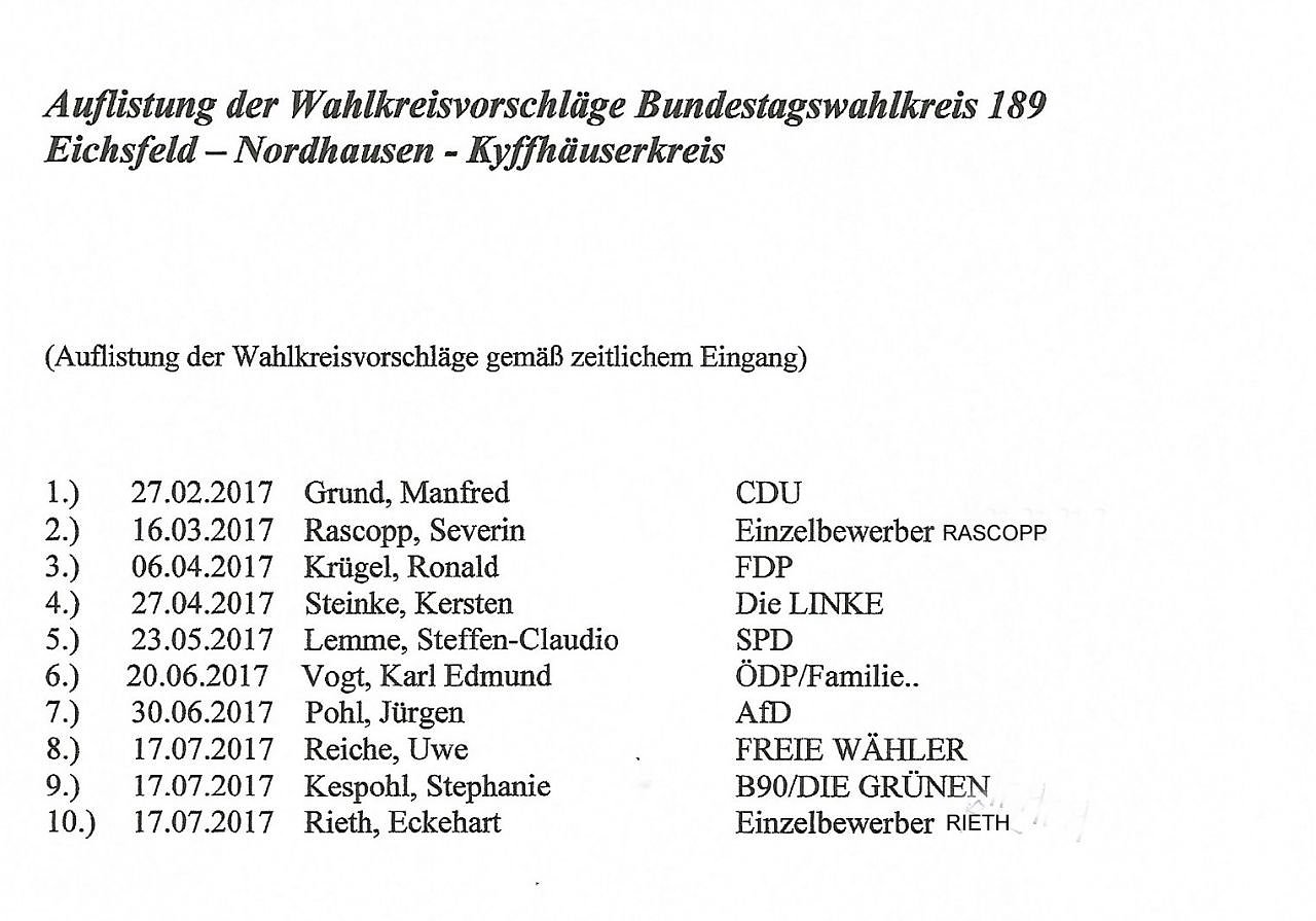 Am Nachmittag tagte in öffentlicher Sitzung im Landratsamt Kyffhäuserkreis der Kreiswahlausschuss für den Bundestagswahlkreis 191(Eichsfeld - Nordhausen - Kyffhäuserkreis)...