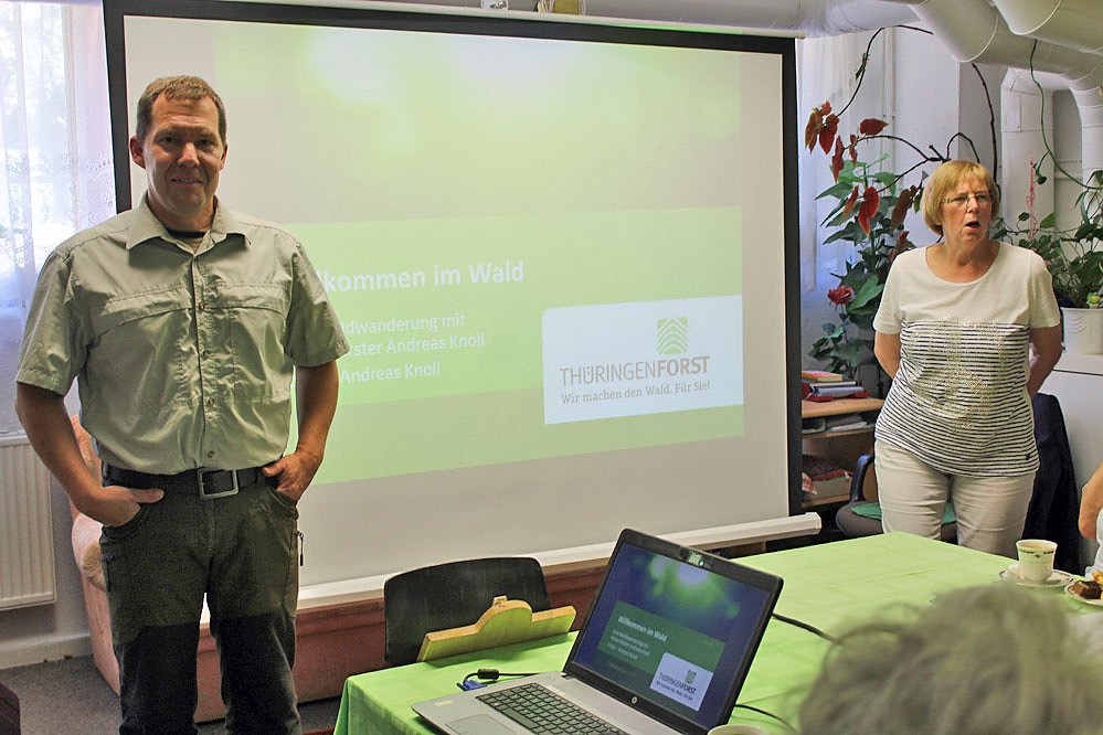 Andreas Knoll, seit zwei Jahren ist er Revierförster auf dem Possen, stellte erst mal sein Revier vor, das immerhin 1.200 Hektar beträgt. Er macht mit dem Revier gut 400.000 Euro Umsatz und beim ThüringenForst bleiben nach Abzug der Aufwendungen (Material, Lohn) bis zu 150.000 Euro hängen, weil man zwischen 7.000 bis 8.000 Festmeter Holz erntet.