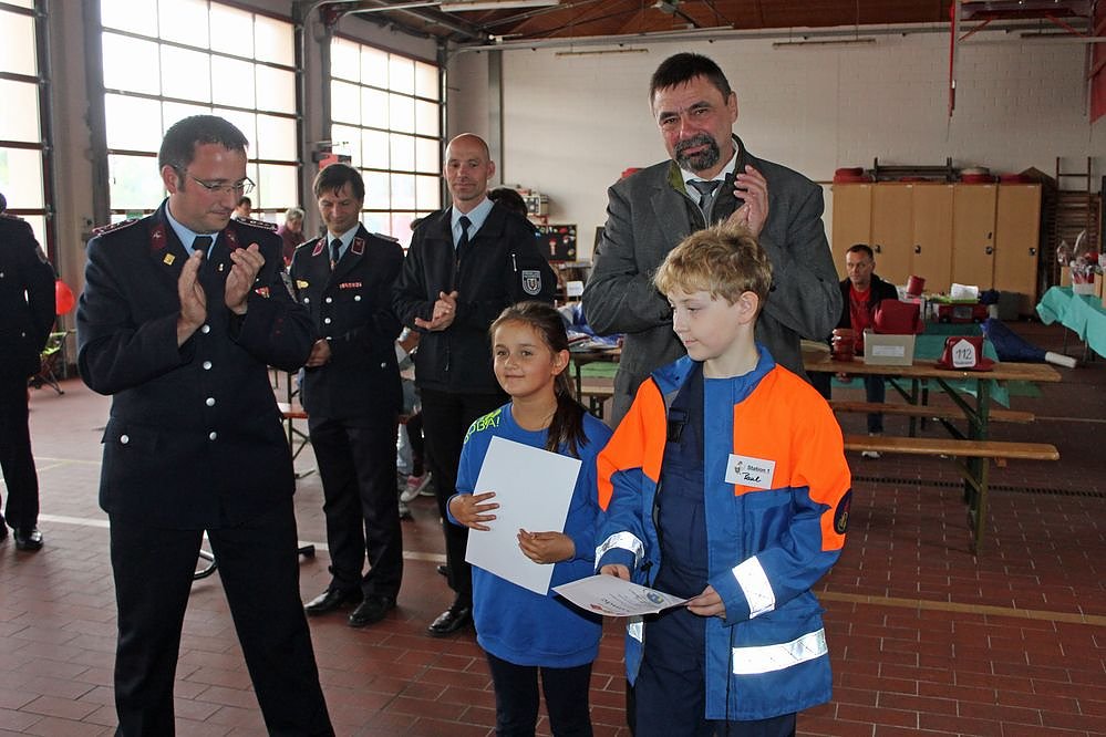 Besonders stolz waren Kristin Trappe (Leistungsabzeichen in Gold) und Paul Hagenbruch (Jugendflamme Stufe Bronze) über die Auszeichnungen die Kreisjugendwart Sebastian Thiersch überreichte.