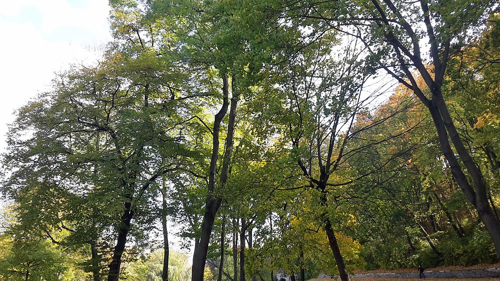 Scheinbar hängen die Bäume noch voller Laub, aber es kommt aber auch schon viel Laub runter.
